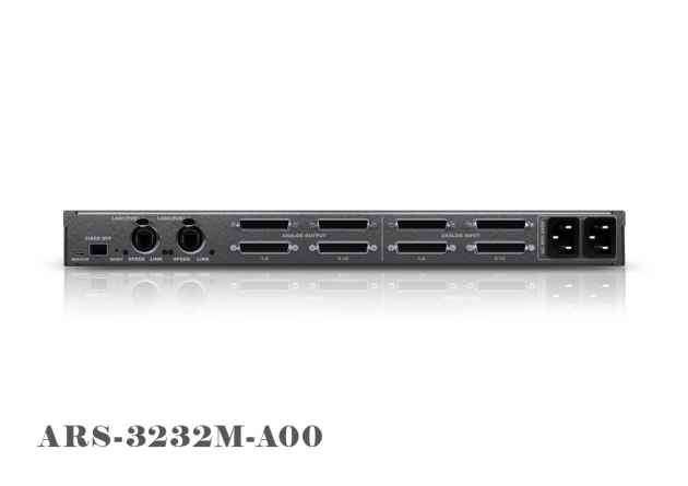 E-Vocal MYRIAD are multiple channel analog input and analog output Dante converters. There are two models that make up the E-Vocal MYRIAD product, ARS-1616M-A00 and ARS-3232M-A00. These models are 1U rack mount analogue converters designed to transfer 16 or 32 analogue audio channels over a Dante network in both directions. Space-saving 25-pin D-sub connectors are provided for use with optional breakout boxes to input and output balanced line-level analogue audio signals. Two etherCON connectors (Dante Primary/Secondary) are available for redundant operation using two separate networks. For high availability operation requirements, dual AC input and dual PoE power sources are available for redundant operation. The units feature indicators for operation status and current sample rate as well as overload LEDs for each input and signal LEDs for each input and output. Any other settings, such as sampling frequency, channel routing or latency, can be made by the free “Dante Controller” computer application. The sampling frequency, power source status, will be displayed on the 2×20 character display located on front bezel.